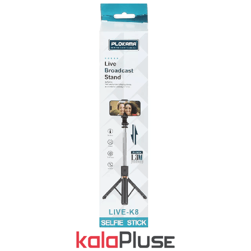 تریپاد و پایه نگهدارنده موبایل plokama مدل K8-live ترکیبی از سهپایه، دسته سلفی و کنترل بلوتوث میباشد که در یک دستگاه جمعوجور که برای عکاسی، یا پخش زنده مناسب است.