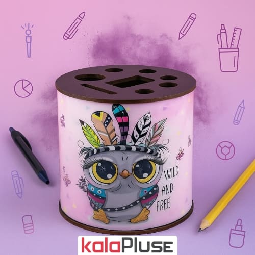 جا قلمی طرح حیوانات دارای قطر 9 سانتیمتر و ارتفاع 9 سانتیمتر تولید شده از MDF سه میلیمتر که می توان به عنوان جا لوازم آرایشی نیز استفاده کرد.
